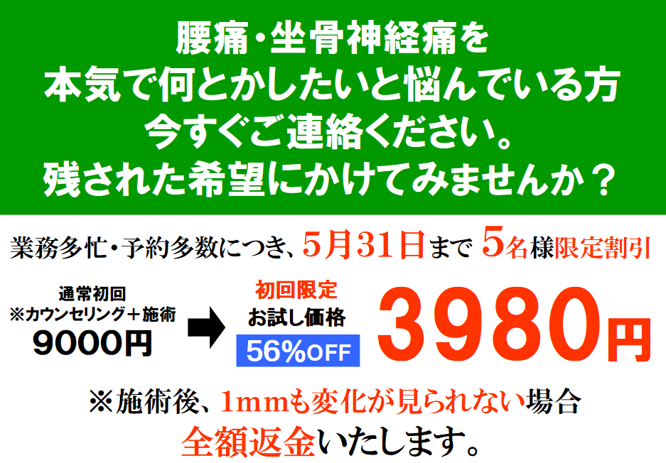 (お試し料金に関しては、通院意思がある方の不安を解消するために設けております。通院の意思がなく初回の安さで来られる方・1回で全ての原因解決を求める方・その場の改善だけを考えている方・揉んで欲しい方などは、改善に対する当院の考え方と相違がありますので、通院されている方のご迷惑になると判断させていただき、以後の施術をお断りします。)