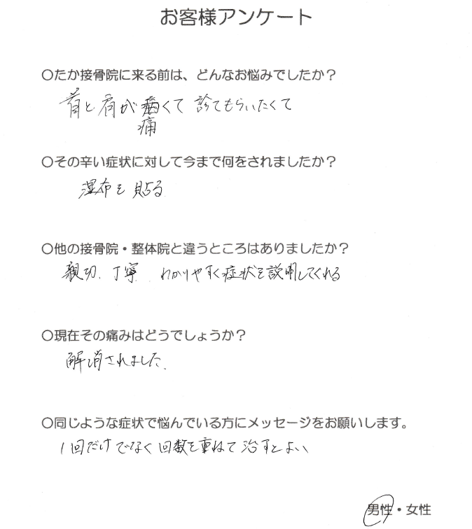 他の治療院に通院するも症状が変わらず、ダメもとで当院にお体を預けていただき心より感謝を申し上げます。